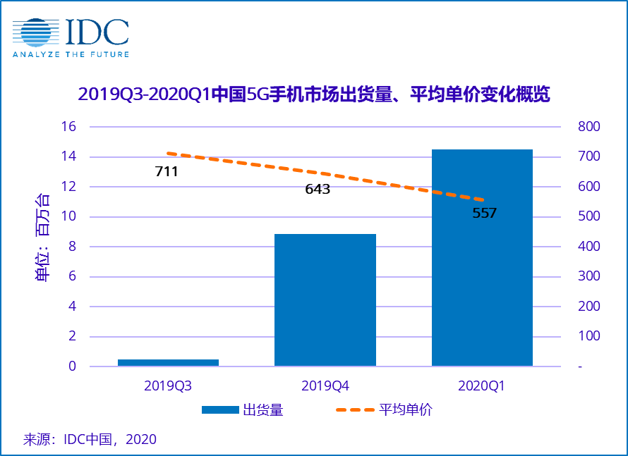 在IDC發(fā)布的手機(jī)季度跟蹤報(bào)告中顯示,2020年第一季度,國(guó)內(nèi)5G手機(jī)出貨量約1450萬(wàn)臺(tái),占整體市場(chǎng)21.8%,環(huán)比上季度增長(zhǎng)64%。