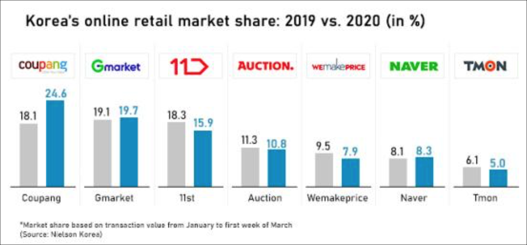 尼爾森韓國的數據顯示,Coupang 在2020年第一季度超過了eBay韓國的Gmarket,成為了韓國第一大電商。尼爾森韓國表示,根據今年1月1日至3月7日的交易量,Coupang以24.6%的市場份額位居榜首,而Gmarket的市場份額則為19.7%,位居第二。