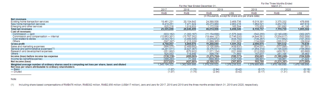 隨之而來的是年營收突發(fā)猛進。招股書顯示,貝殼找房2018年、2019年、2020年一季度營收分別為286.46億元、460億元、71.2億元。收入主要來自住房交易和服務(wù)的傭金,其中2019年二手房交易和新房交易收入分別為246億元人民幣和202億元人民幣。不過,貝殼尚未盈利,同期凈虧損分別為4.27億元、21.8億元和12.31億元。